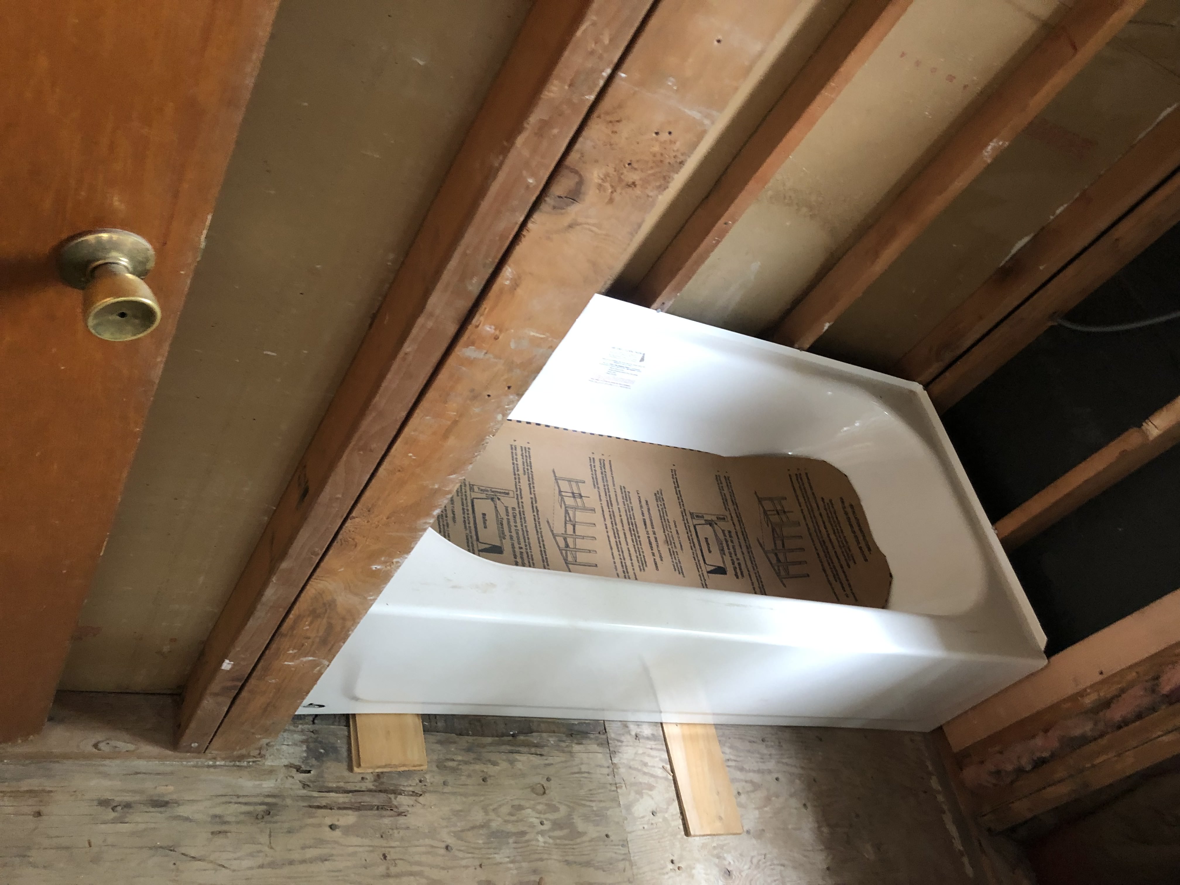 We then installed the bathtub. First you use a level backerboard to make the back edge plumb, and then use shims to level the tub from front to back. The tub is then set in a mortar bed which provides the sturdy feel without any flex. Before the mortar bed sets, you drill pilot screws, and secure the tub to the studs.